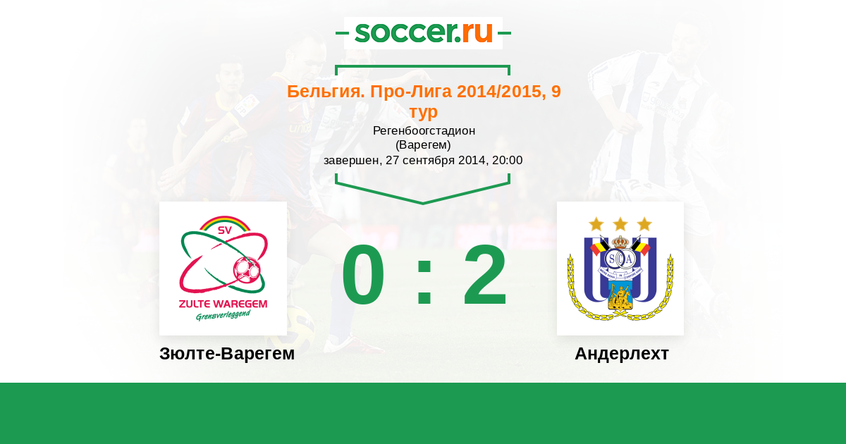 Бельгия. Про-Лига 18.10.2015 Зюлте-Варегем Логотип футбольный клуб Зюлте-Варегем 0:4 Логотип футбольный клуб Андерлехт (Брюссель) Андерлехт