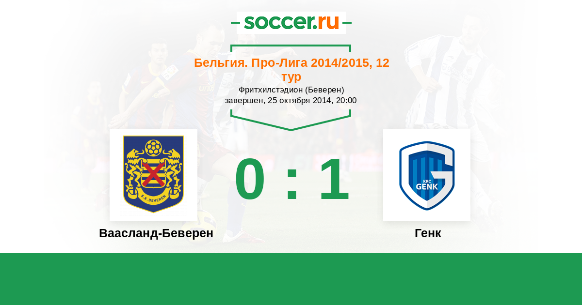 Бельгия. Про-Лига 17.10.2015 Ваасланд-Беверен Логотип футбольный клуб Ваасланд-Беверен 0:1 Логотип футбольный клуб Генк Генк