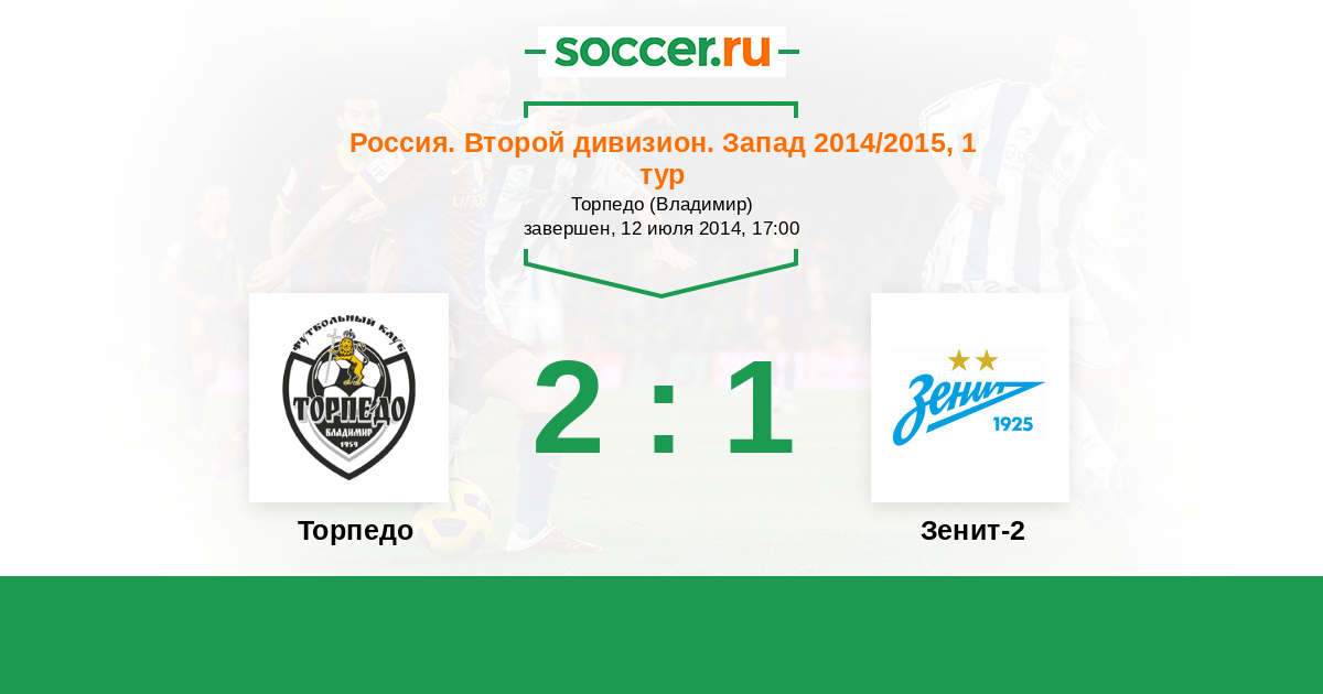 Россия. Вторая лига. Группа 2 05.06.2015 Зенит-2 Логотип футбольный клуб Зенит-2 (Санкт-Петербург) 5:2 Логотип футбольный клуб Торпедо (Владимир) Торпедо