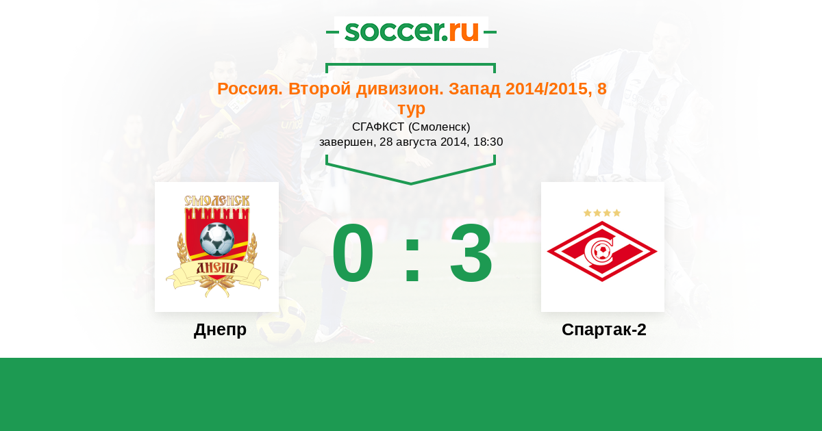 Россия. Вторая лига. Группа 2 17.04.2015 Спартак-2 Логотип футбольный клуб Спартак-2 (Москва) 3:1 Логотип футбольный клуб Днепр (Смоленск) Днепр
