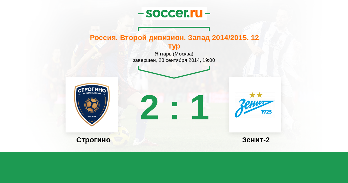 Россия. Вторая лига. Группа 2 12.05.2015 Зенит-2 Логотип футбольный клуб Зенит-2 (Санкт-Петербург) 3:1 Логотип футбольный клуб Строгино (Москва) Строгино