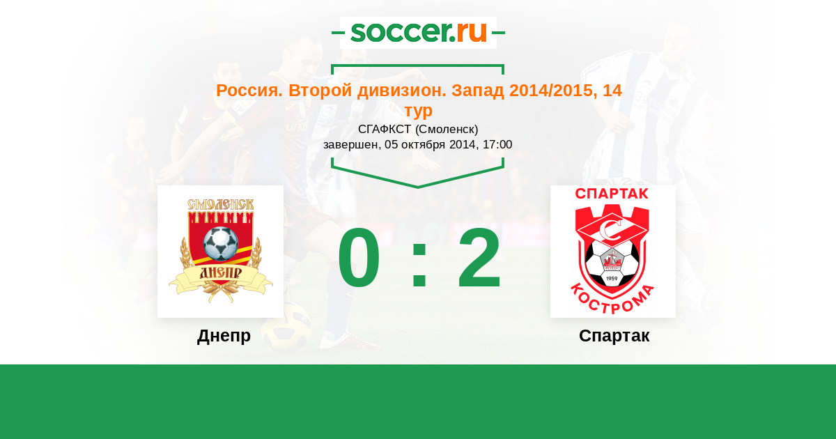 Россия. Вторая лига. Группа 2 24.05.2014 Днепр Логотип футбольный клуб Днепр (Смоленск) 2:1 Логотип футбольный клуб Спартак Кострома Спартак Кострома