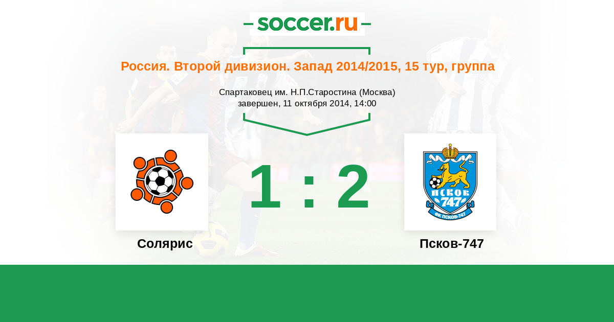 Россия. Вторая лига. Группа 2 30.05.2015 Псков-747 Логотип футбольный клуб Псков-747 2:2 Логотип Солярис (Москва) Солярис