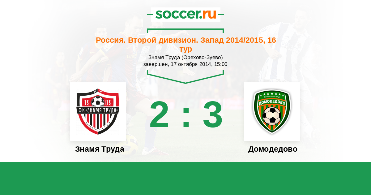 Россия. Вторая лига. Группа 2 18.07.2014 Домодедово Логотип футбольный клуб Домодедово (Москва) 2:2 Логотип футбольный клуб Знамя Труда (Орехово-Зуево) Знамя Труда