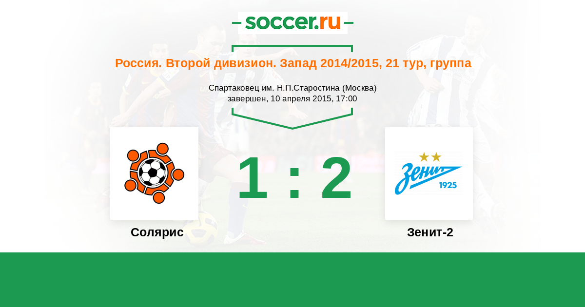 Россия. Вторая лига. Группа 2 22.08.2014 Зенит-2 Логотип футбольный клуб Зенит-2 (Санкт-Петербург) 11:0 Логотип Солярис (Москва) Солярис