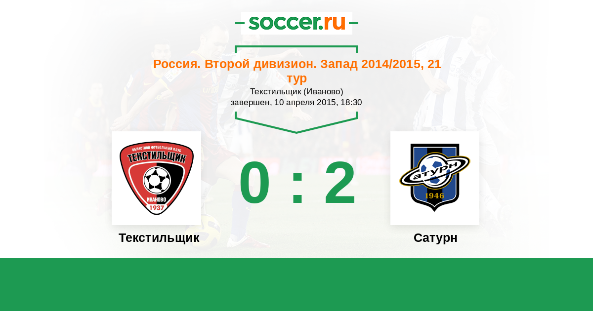 Россия. Вторая лига. Группа 2 22.08.2014 Сатурн Логотип футбольный клуб Сатурн (Раменское) 1:0 Логотип футбольный клуб Текстильщик (Иваново) Текстильщик
