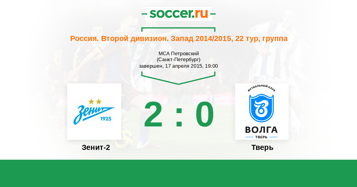 Россия. Вторая лига. Группа 2 10.05.2014 Зенит-2 Логотип футбольный клуб Зенит-2 (Санкт-Петербург) 1:0 Логотип футбольный клуб Тверь Тверь