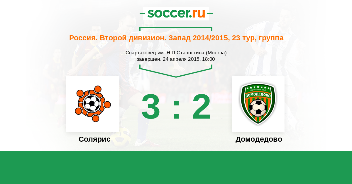 Россия. Вторая лига. Группа 2 01.09.2015 Домодедово Логотип футбольный клуб Домодедово (Москва) 0:1 Логотип Солярис (Москва) Солярис