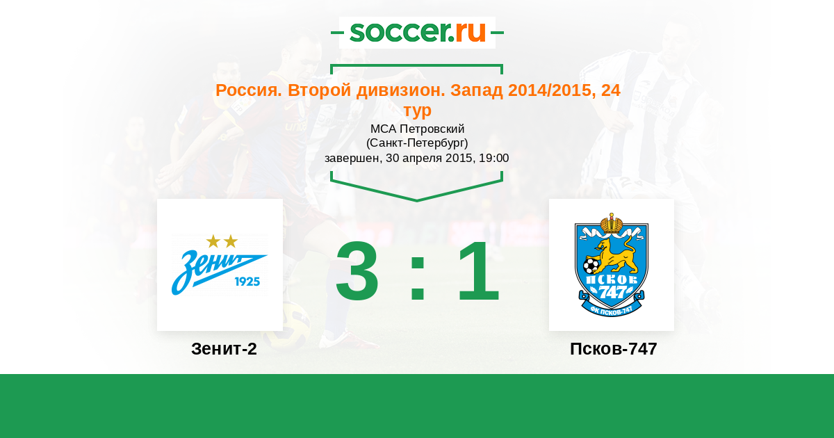 Россия. Вторая лига. Группа 3 05.06.2014 Зенит-2 Логотип футбольный клуб Зенит-2 (Санкт-Петербург) 0:3 Логотип футбольный клуб Псков-747 Псков-747