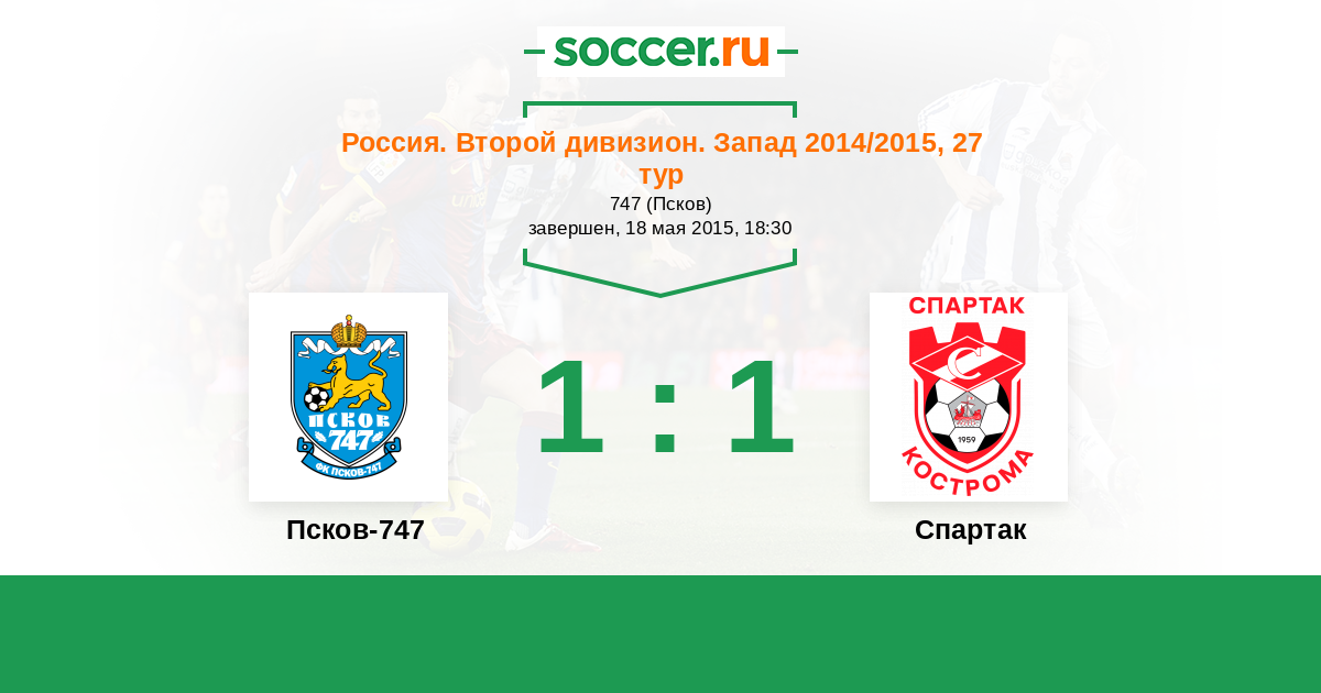 Россия. Вторая лига. Группа 2 07.05.2014 Псков-747 Логотип футбольный клуб Псков-747 3:1 Логотип футбольный клуб Спартак Кострома Спартак Кострома