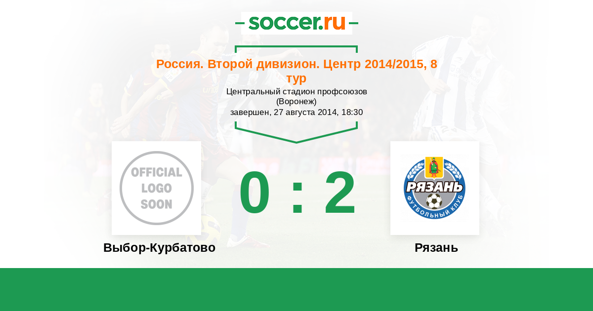 Россия. Вторая лига. Группа 3 17.04.2015 Рязань Логотип футбольный клуб Рязань 3:0 Логотип футбольный клуб Выбор-Курбатово (Воронеж) Выбор-Курбатово