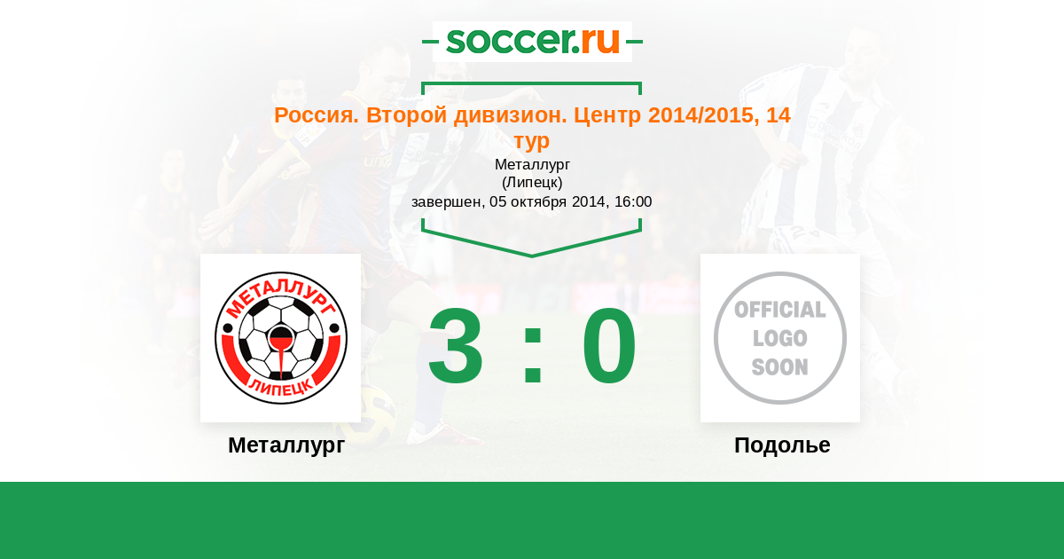 Россия. Вторая лига. Группа 3 21.04.2014 Металлург Логотип футбольный клуб Металлург (Липецк) 1:2 Логотип футбольный клуб Подолье (Подольский район) Подолье
