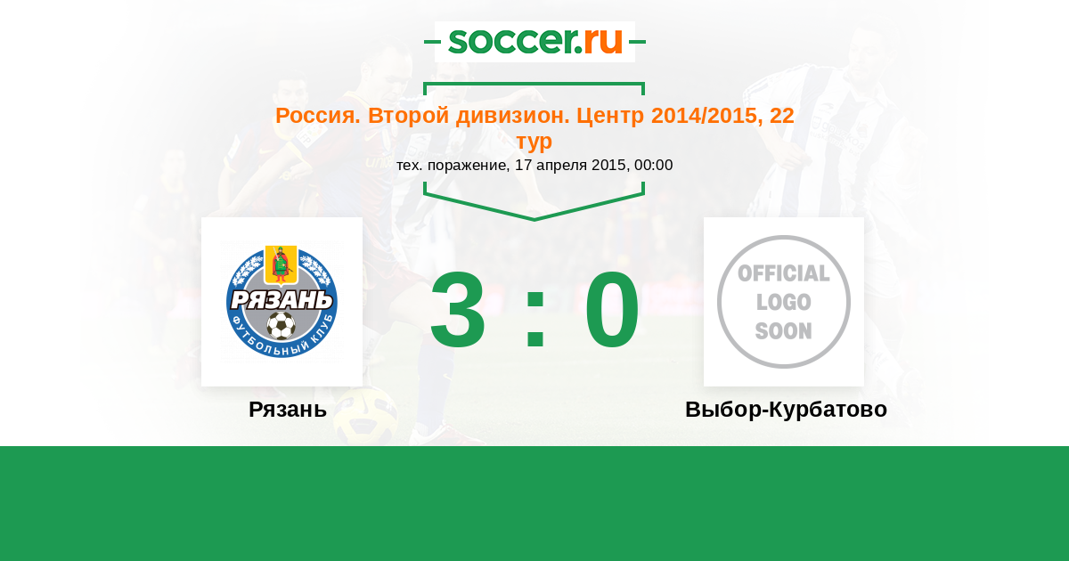 Россия. Вторая лига. Группа 3 17.04.2015 Рязань Логотип футбольный клуб Рязань 3:0 Логотип футбольный клуб Выбор-Курбатово (Воронеж) Выбор-Курбатово