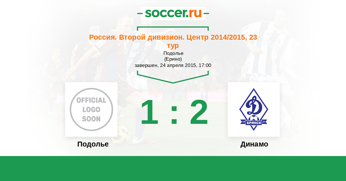 Россия. Вторая лига. Группа 3 24.04.2015 Подолье Логотип футбольный клуб Подолье (Подольский район) 1:2 Логотип футбольный клуб Динамо Брянск Динамо Брянск