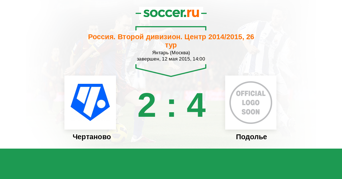 Россия. Вторая лига. Группа 3 23.09.2014 Подолье Логотип футбольный клуб Подолье (Подольский район) 2:1 Логотип футбольный клуб Чертаново (Москва) Чертаново