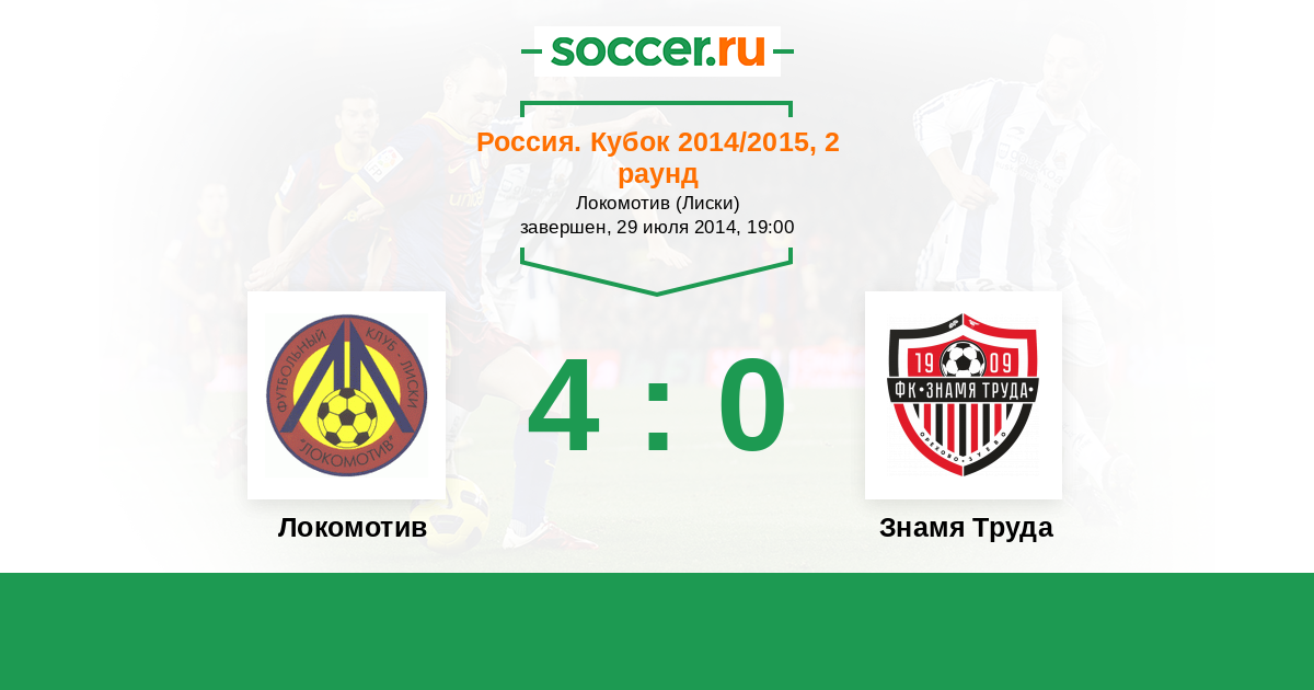 Россия. Вторая лига. Группа 3 25.06.2009 Знамя Труда Логотип футбольный клуб Знамя Труда (Орехово-Зуево) 0:0 Логотип футбольный клуб Локомотив (Лиски) Локомотив