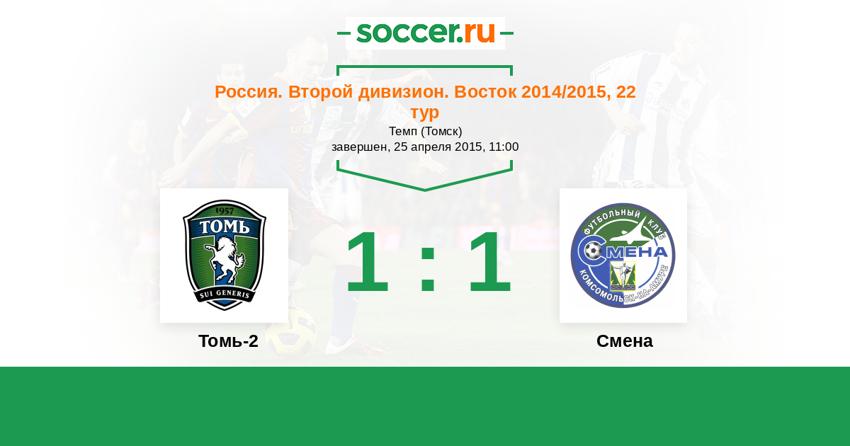 Россия. 2-й дивизион. Восток 20.08.2015 Смена Логотип футбольный клуб Смена (Комсомольск-на-Амуре) 2:1 Логотип футбольный клуб Томь-2 (Томск) Томь-2