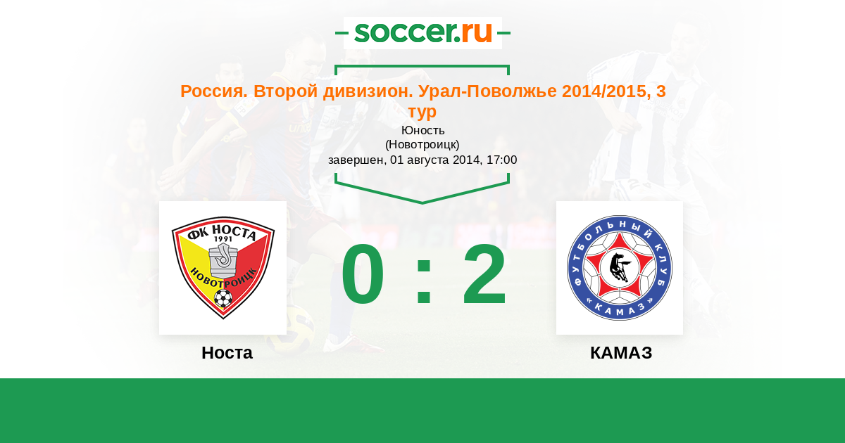 Россия. Вторая лига. Группа 4 28.09.2014 КАМАЗ Логотип футбольный клуб КАМАЗ (Набережные Челны) 2:1 Логотип футбольный клуб Носта (Новотроицк) Носта