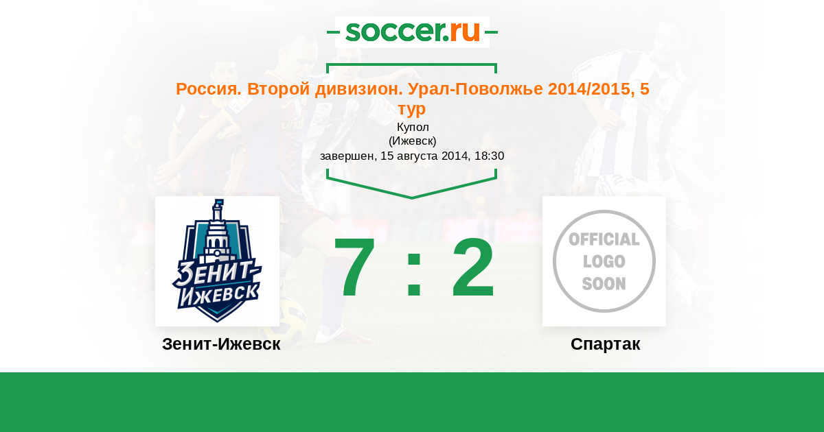 Россия. Вторая лига. Группа 4 10.10.2014 Спартак Логотип футбольный клуб Спартак (Йошкар-Ола) 0:4 Логотип футбольный клуб Зенит-Ижевск Зенит-Ижевск