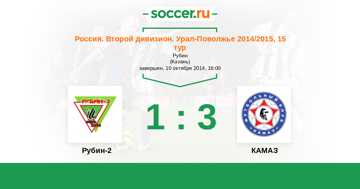 Россия. Вторая лига. Группа 4 05.06.2015 Рубин-2 Логотип футбольный клуб Рубин-2 (Казань) 2:1 Логотип футбольный клуб КАМАЗ (Набережные Челны) КАМАЗ