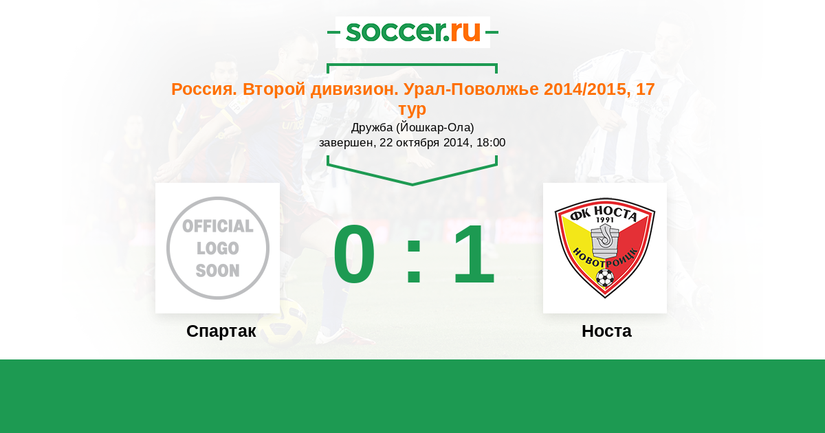 Россия. Вторая лига. Группа 4 22.10.2014 Спартак Логотип футбольный клуб Спартак (Йошкар-Ола) 0:1 Логотип футбольный клуб Носта (Новотроицк) Носта