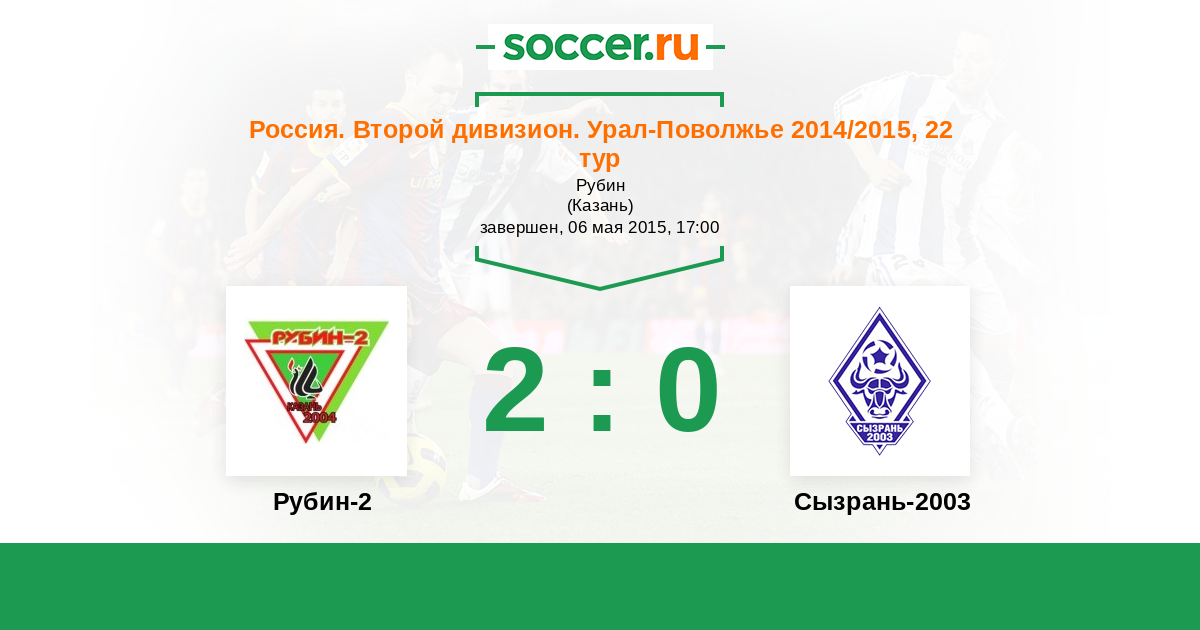 Россия. Вторая лига. Группа 4 18.05.2015 Сызрань-2003 Логотип футбольный клуб Сызрань-2003 0:0 Логотип футбольный клуб Рубин-2 (Казань) Рубин-2