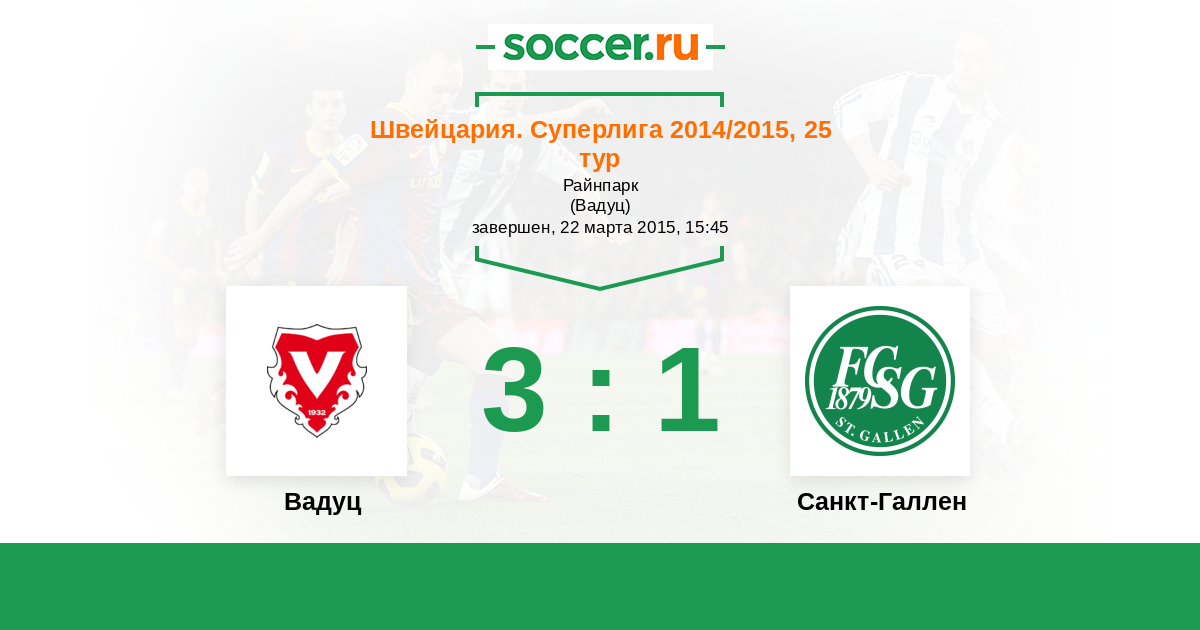 Швейцария. Суперлига 26.04.2015 Санкт-Галлен Логотип футбольный клуб Санкт-Галлен 1:2 Логотип футбольный клуб Вадуц Вадуц