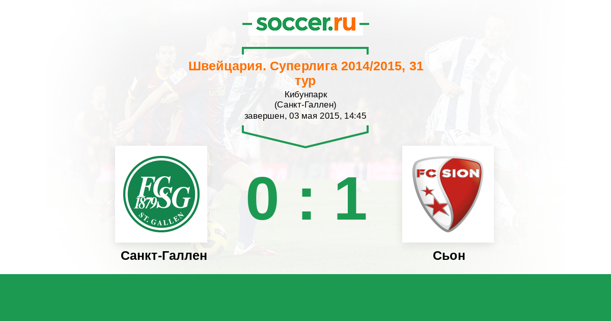 Швейцария. Суперлига 18.03.2015 Сьон Логотип футбольный клуб Сьон 3:0 Логотип футбольный клуб Санкт-Галлен Санкт-Галлен