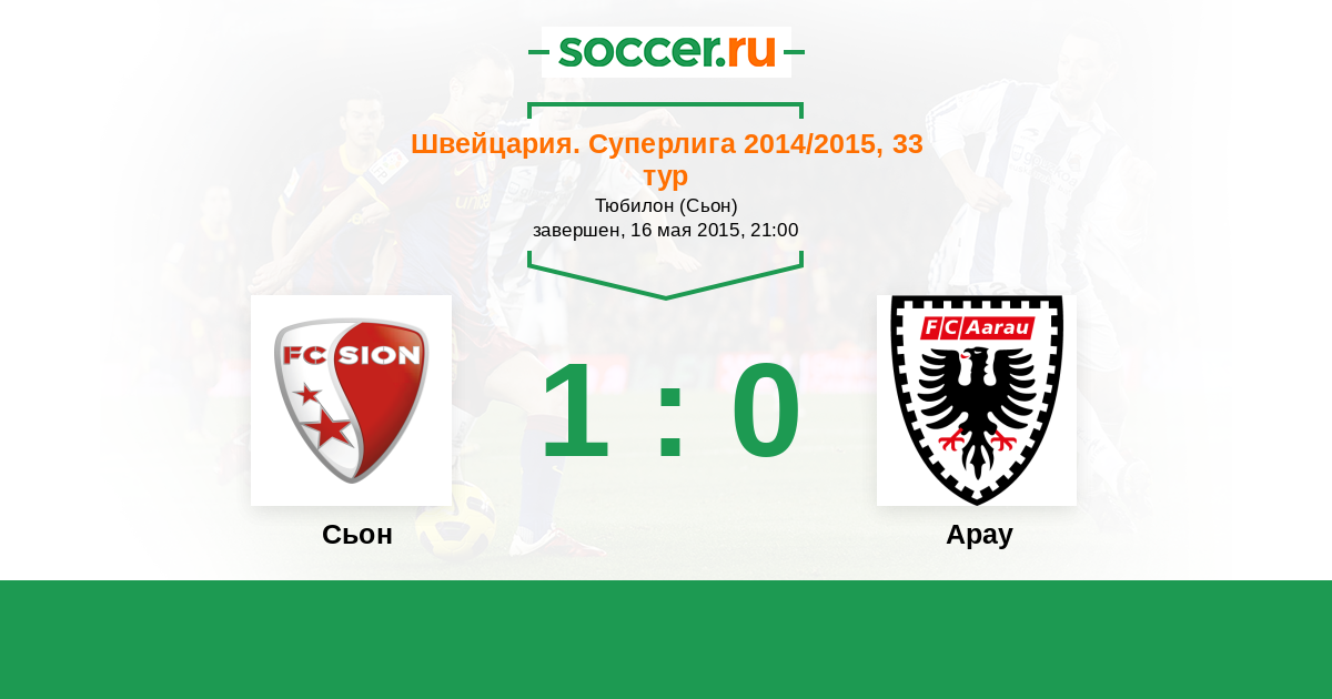 Швейцария. Суперлига 12.04.2015 Арау Логотип футбольный клуб Арау 0:1 Логотип футбольный клуб Сьон Сьон