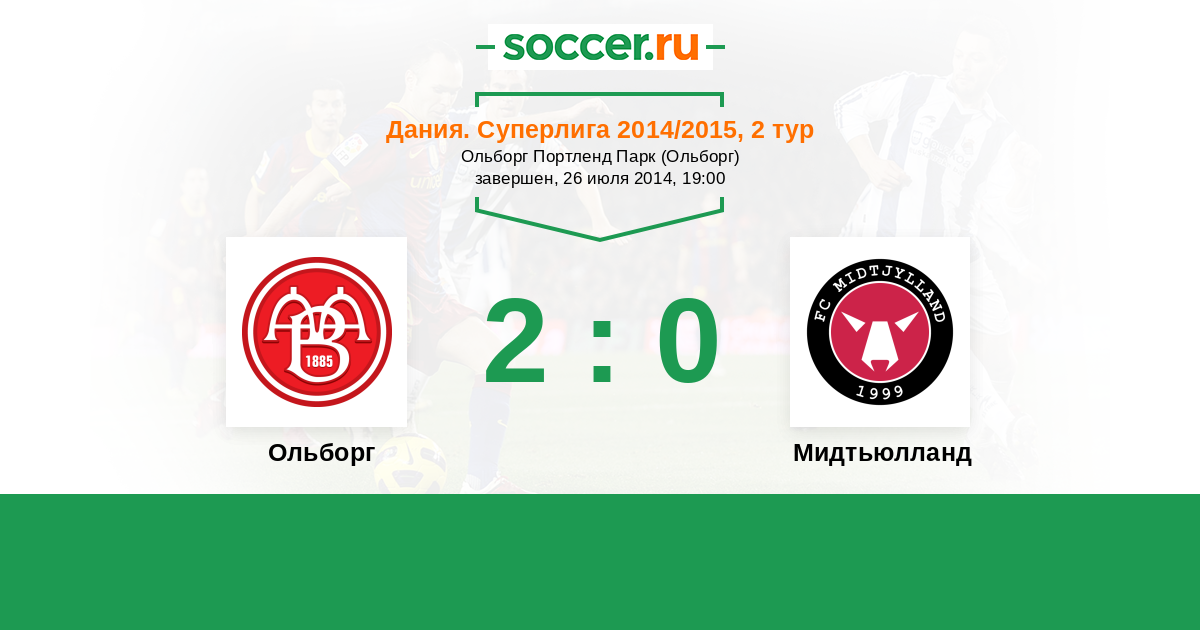 Дания. Суперлига 10.08.2015 Ольборг Логотип футбольный клуб Ольборг 0:2 Логотип футбольный клуб Мидтьюлланд (Хернинг) Мидтьюлланд