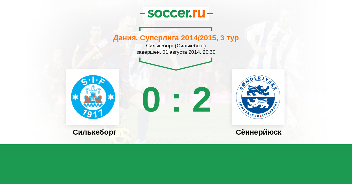 Дания. Суперлига 02.05.2015 Силькеборг Логотип футбольный клуб Силькеборг 2:2 Логотип футбольный клуб Сённерйюск (Хадерслев) Сённерйюск