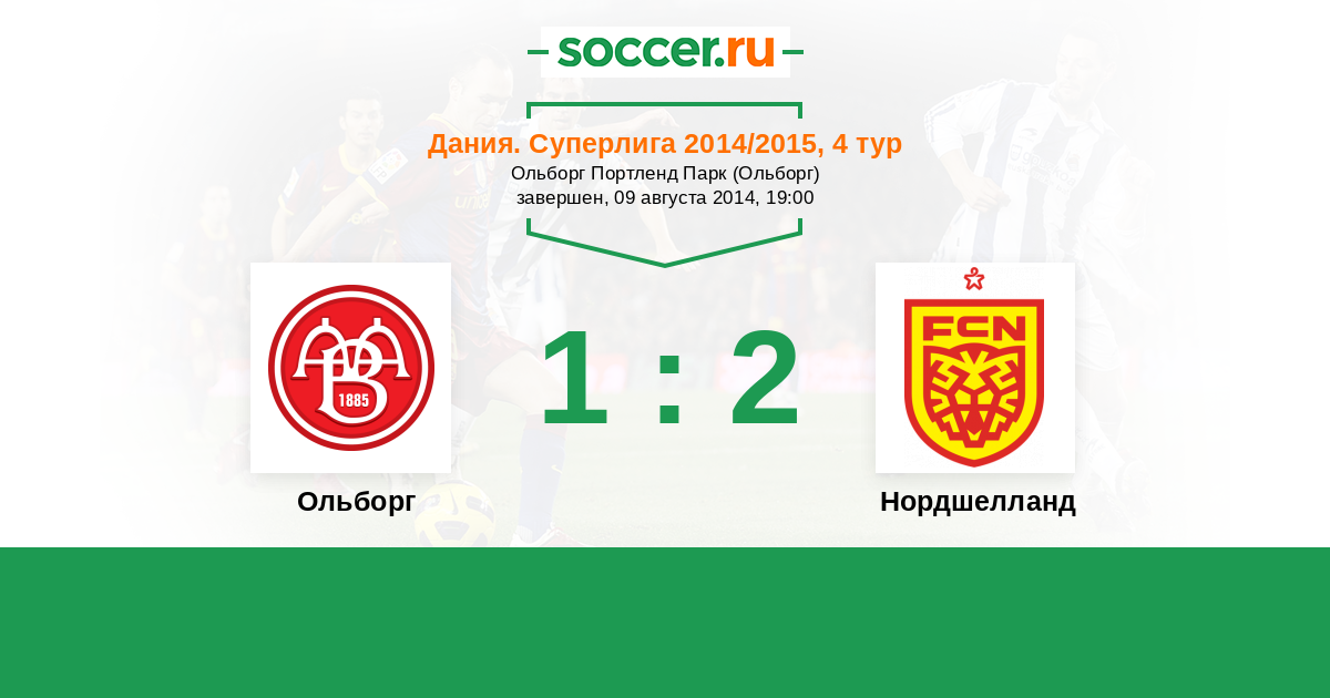 Дания. Суперлига 03.08.2015 Нордшелланд Логотип футбольный клуб Нордшелланд (Фарум) 2:1 Логотип футбольный клуб Ольборг Ольборг