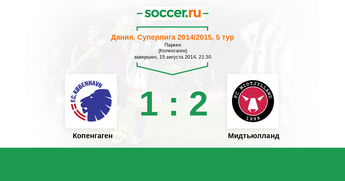 Дания. Суперлига 14.08.2015 Мидтьюлланд Логотип футбольный клуб Мидтьюлланд (Хернинг) 0:0 Логотип футбольный клуб Копенгаген Копенгаген