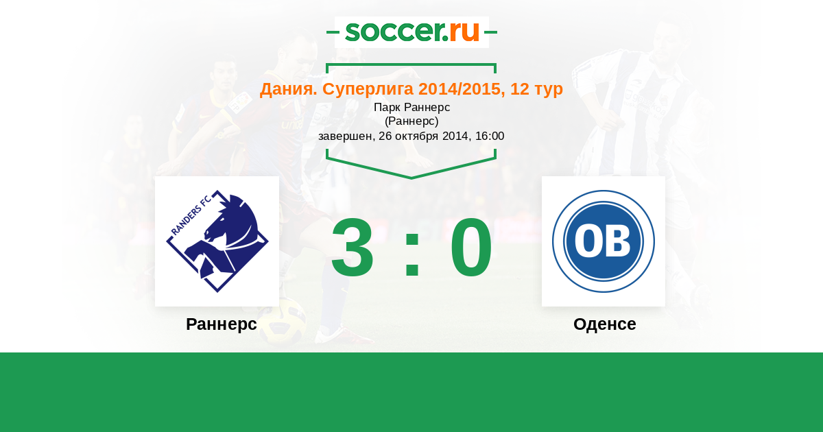 Дания. Суперлига 17.08.2014 Раннерс Логотип футбольный клуб Раннерс 0:2 Логотип футбольный клуб Оденсе Оденсе