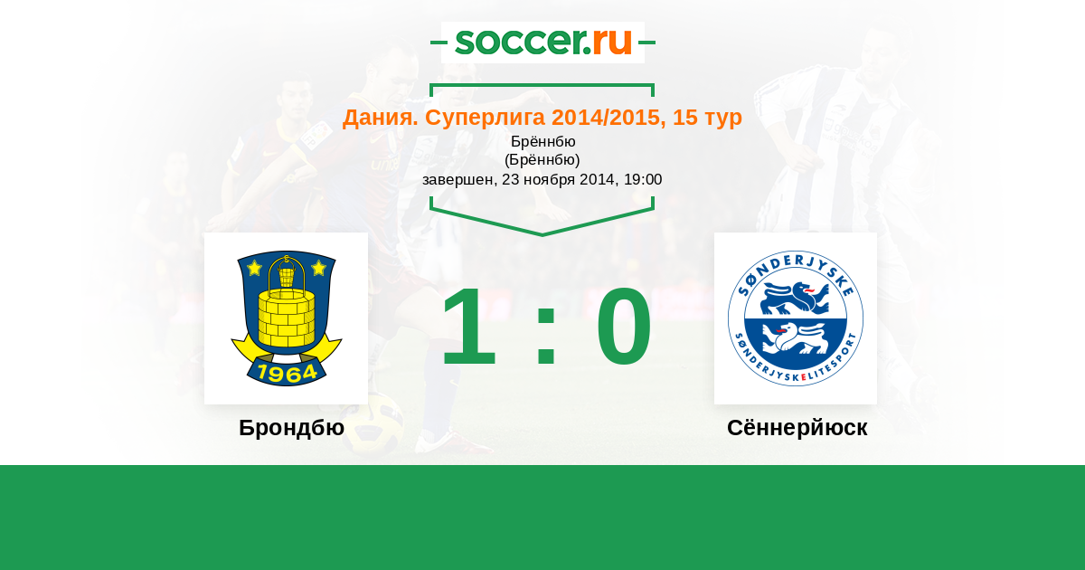Дания. Суперлига 23.08.2015 Брондбю Логотип футбольный клуб Брондбю (Брённбю) 1:0 Логотип футбольный клуб Сённерйюск (Хадерслев) Сённерйюск