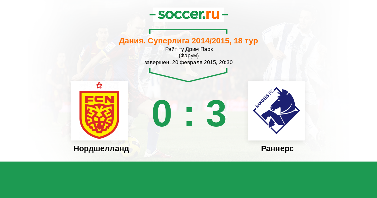 Дания. Суперлига 08.05.2015 Раннерс Логотип футбольный клуб Раннерс 2:0 Логотип футбольный клуб Нордшелланд (Фарум) Нордшелланд
