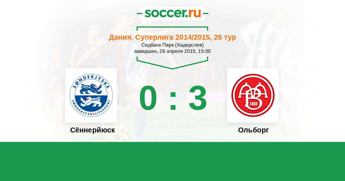 Дания. Суперлига 22.03.2015 Ольборг Логотип футбольный клуб Ольборг 1:4 Логотип футбольный клуб Сённерйюск (Хадерслев) Сённерйюск