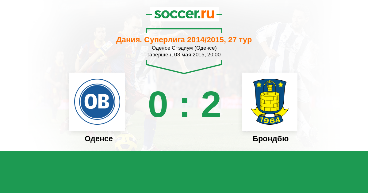 Дания. Суперлига 15.03.2015 Брондбю Логотип футбольный клуб Брондбю (Брённбю) 2:0 Логотип футбольный клуб Оденсе Оденсе