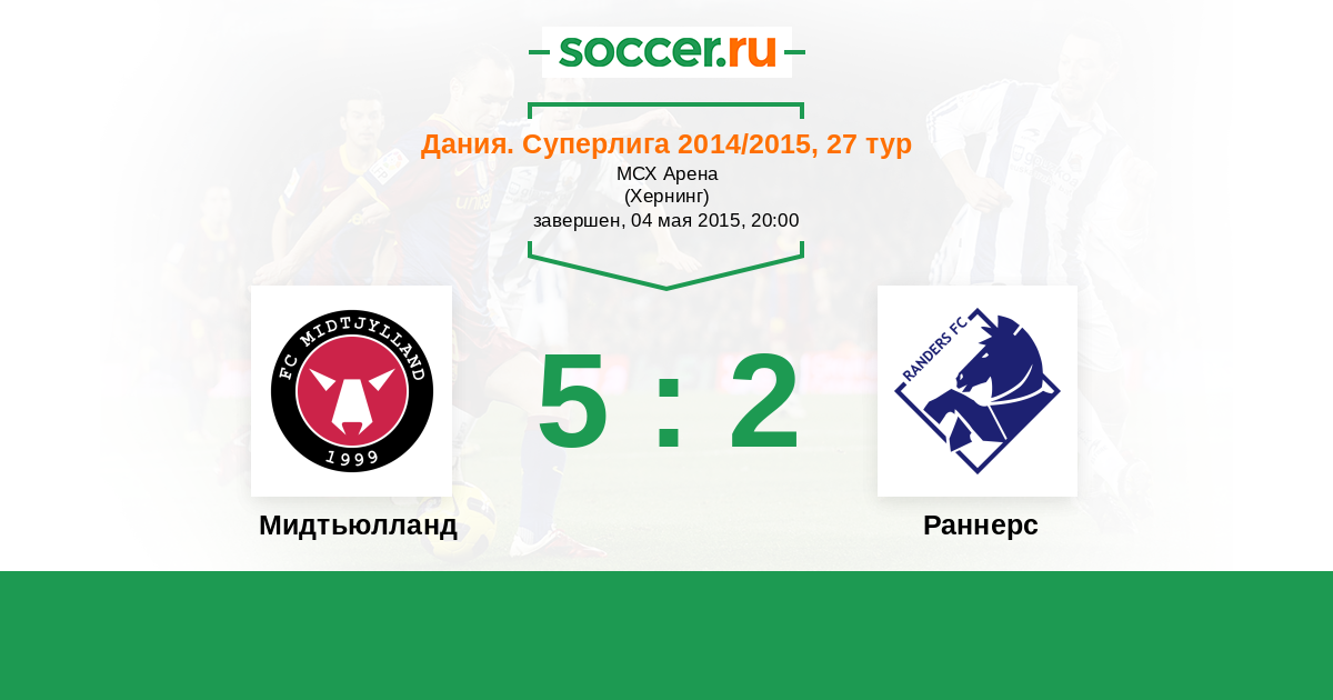 Дания. Суперлига 04.08.2014 Мидтьюлланд Логотип футбольный клуб Мидтьюлланд (Хернинг) 3:1 Логотип футбольный клуб Раннерс Раннерс