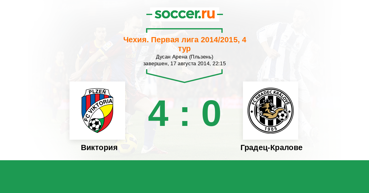 Чехия. Первая Лига 29.07.2012 Виктория Логотип футбольный клуб Виктория (Пльзень) 3:0 Логотип футбольный клуб Градец-Кралове Градец-Кралове