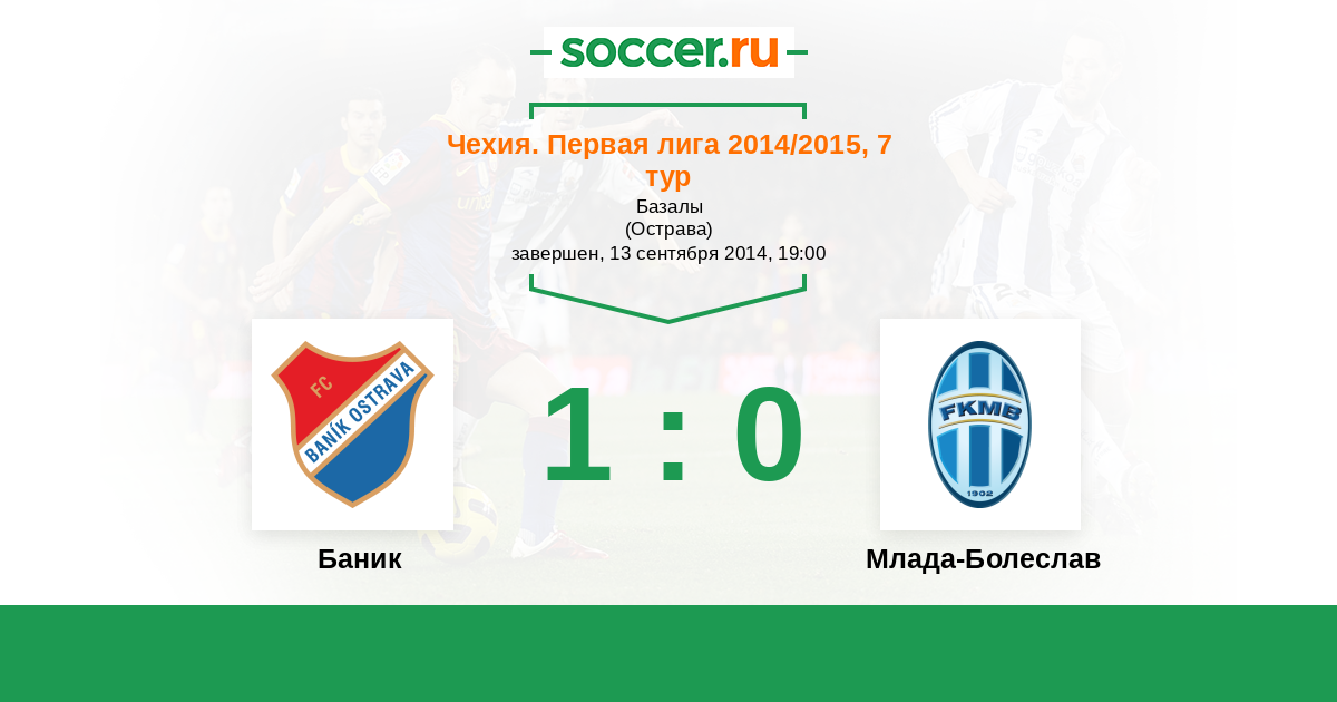 Чехия. Первая Лига 27.07.2013 Баник Логотип футбольный клуб Баник (Острава) 2:1 Логотип футбольный клуб Млада-Болеслав Млада-Болеслав