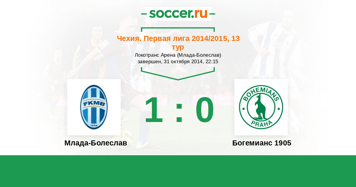 Чехия. Первая Лига 04.05.2014 Млада-Болеслав Логотип футбольный клуб Млада-Болеслав 1:0 Логотип футбольный клуб Богемианс 1905 (Прага) Богемианс 1905