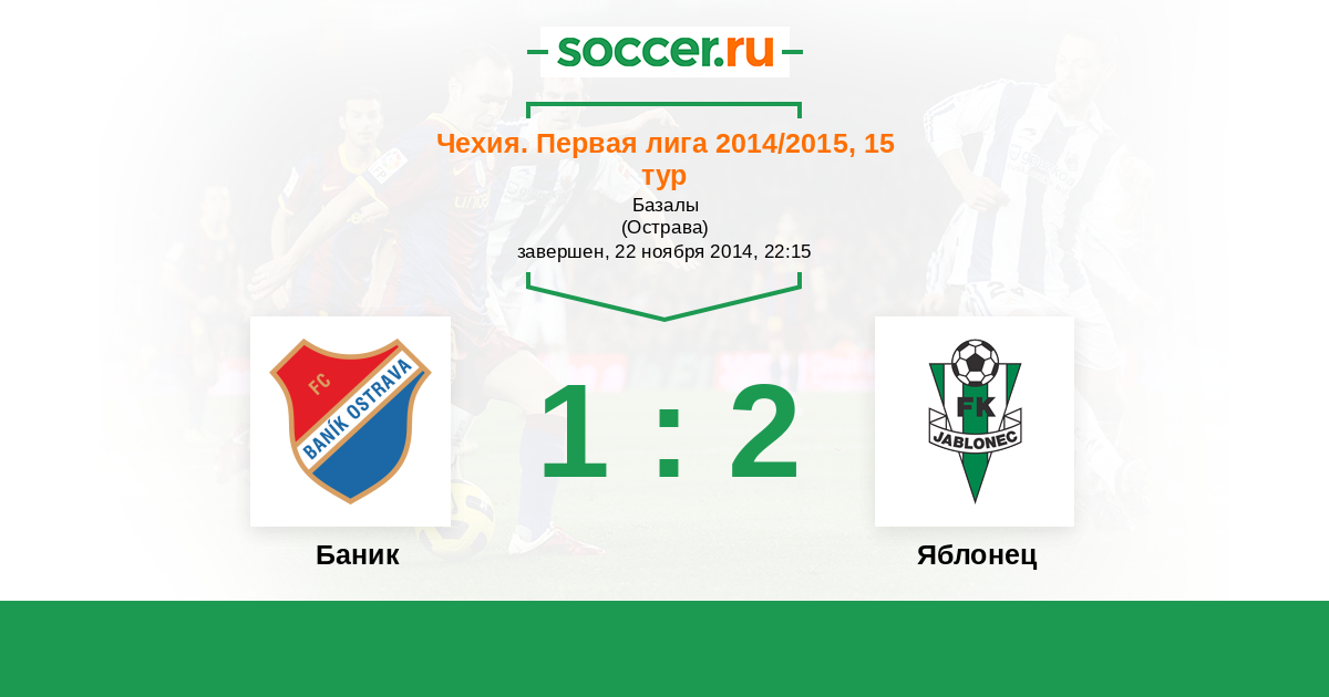 Чехия. Первая Лига 19.09.2015 Баник Логотип футбольный клуб Баник (Острава) 1:2 Логотип футбольный клуб Яблонец (Яблонец-над-Нисоу) Яблонец