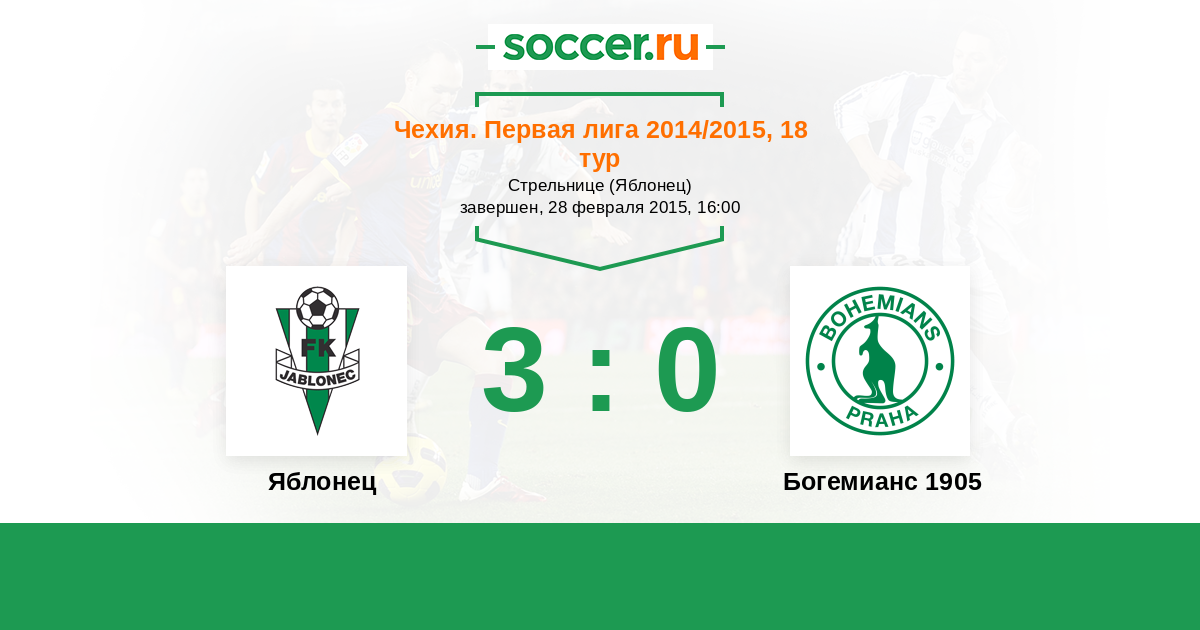 Чехия. Первая Лига 16.08.2014 Богемианс 1905 Логотип футбольный клуб Богемианс 1905 (Прага) 1:2 Логотип футбольный клуб Яблонец (Яблонец-над-Нисоу) Яблонец