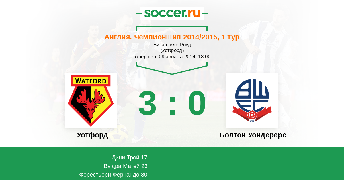 Протокол матча Уотфорд против Болтон Уондерерс