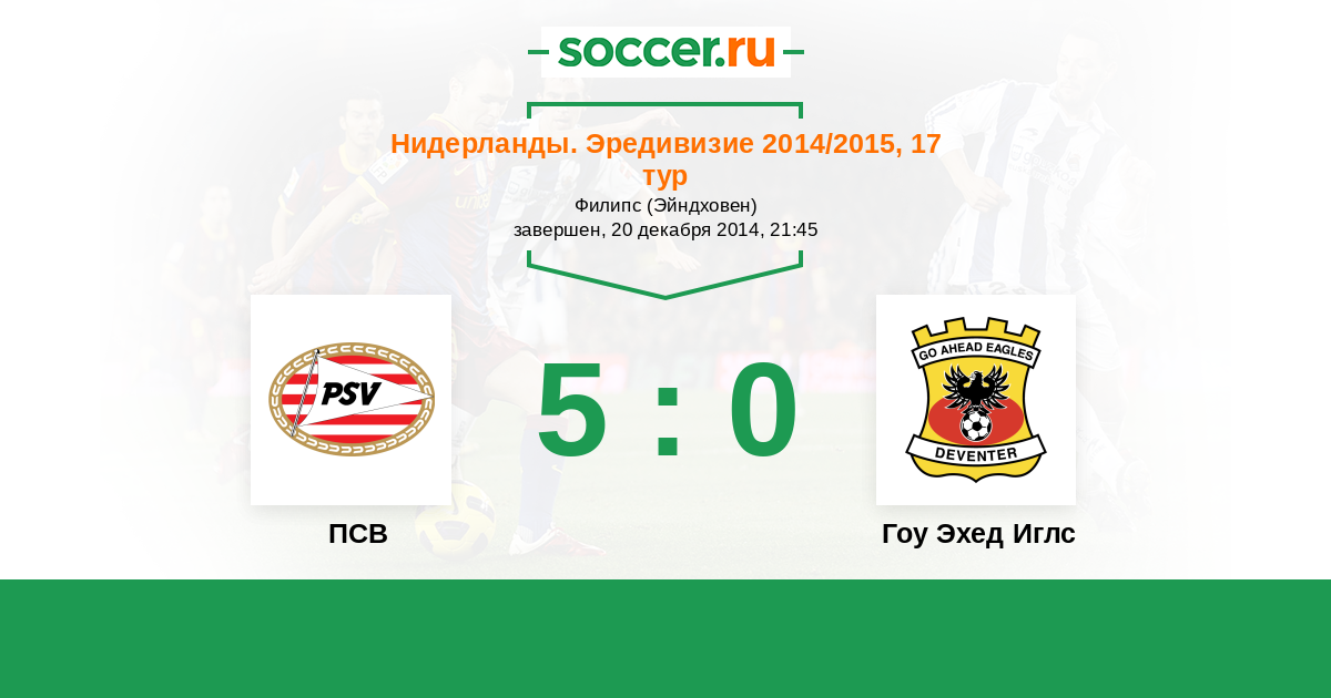 Нидерланды. Эредивизи 10.12.2016 ПСВ Логотип футбольный клуб ПСВ (Эйндховен) 1:0 Логотип футбольный клуб Гоу Эхед Иглс (Девентер) Гоу Эхед Иглс