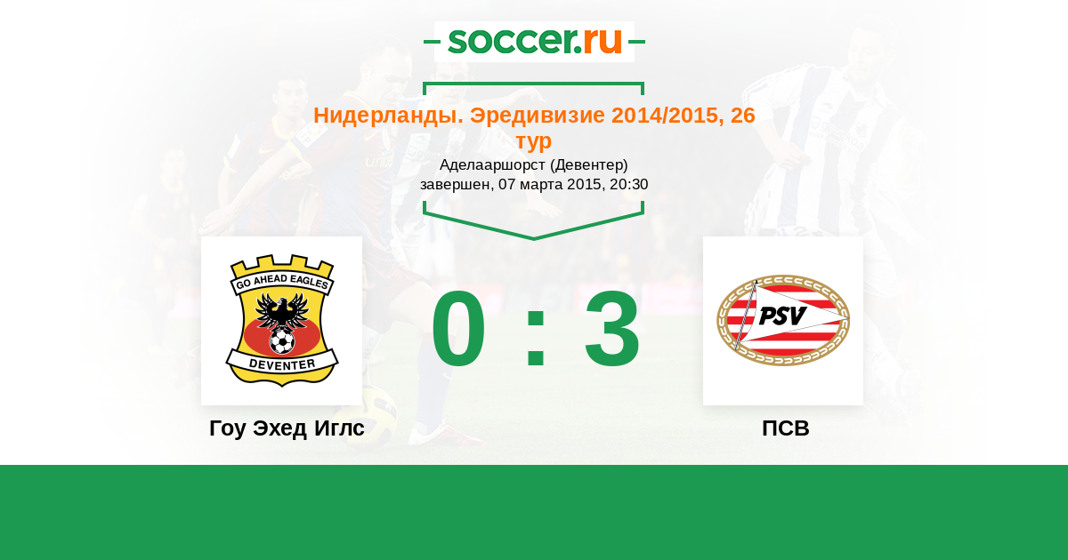 Нидерланды. Эредивизи 20.12.2014 ПСВ Логотип футбольный клуб ПСВ (Эйндховен) 5:0 Логотип футбольный клуб Гоу Эхед Иглс (Девентер) Гоу Эхед Иглс