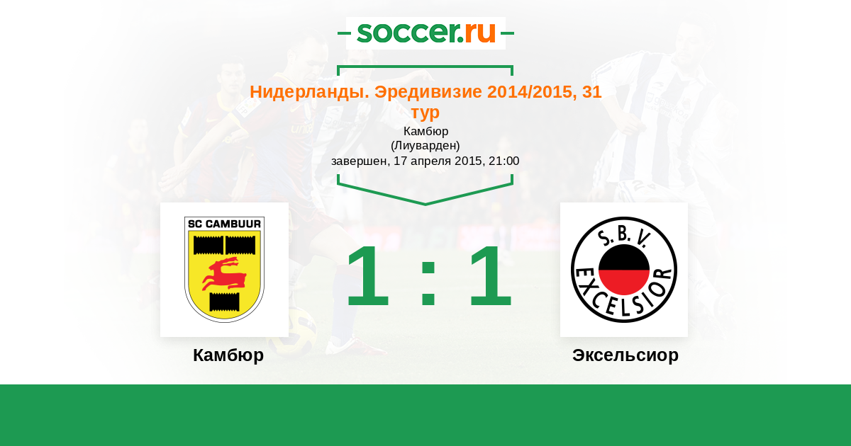 Нидерланды. Эредивизи 28.09.2014 Эксельсиор Логотип футбольный клуб Эксельсиор (Роттердам) 1:1 Логотип футбольный клуб Камбюр (Лиуварден) Камбюр