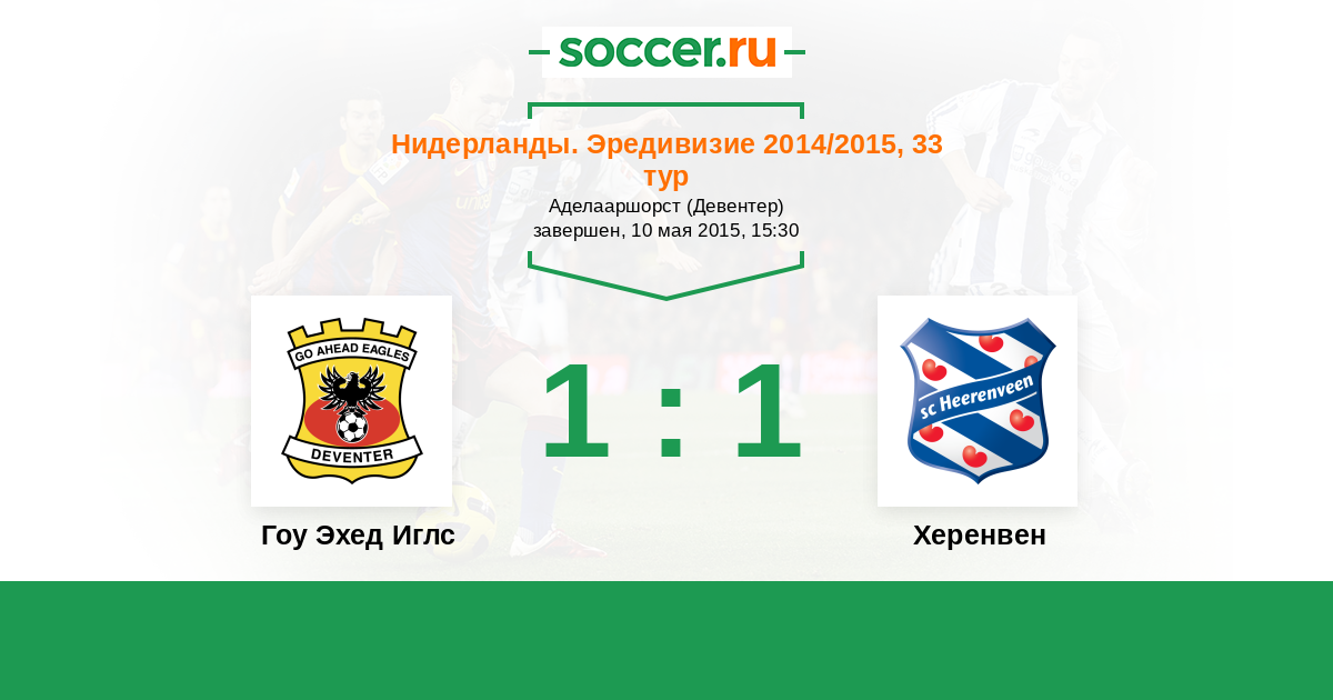 Нидерланды. Эредивизи 12.04.2014 Гоу Эхед Иглс Логотип футбольный клуб Гоу Эхед Иглс (Девентер) 0:2 Логотип футбольный клуб Херенвен Херенвен