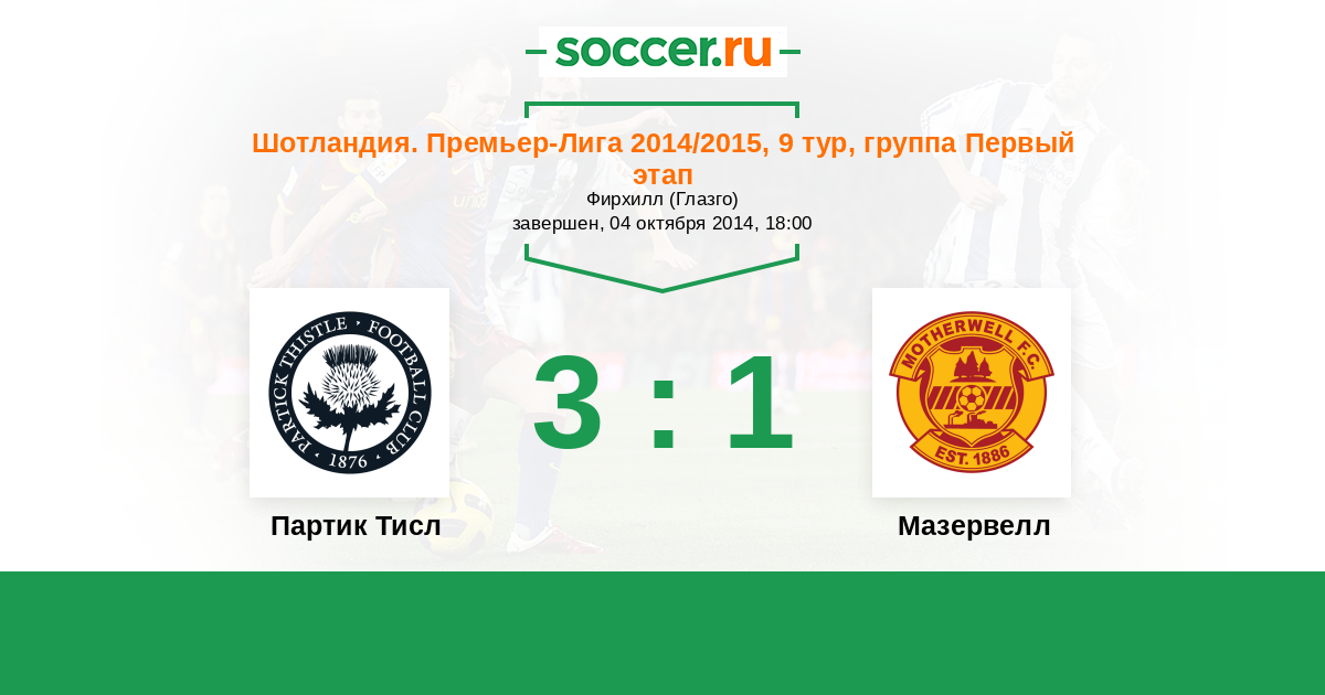 Шотландия. Премьер-Лига 11.04.2015 Партик Тисл Логотип футбольный клуб Партик Тисл (Глазго) 2:0 Логотип футбольный клуб Мазервелл Мазервелл